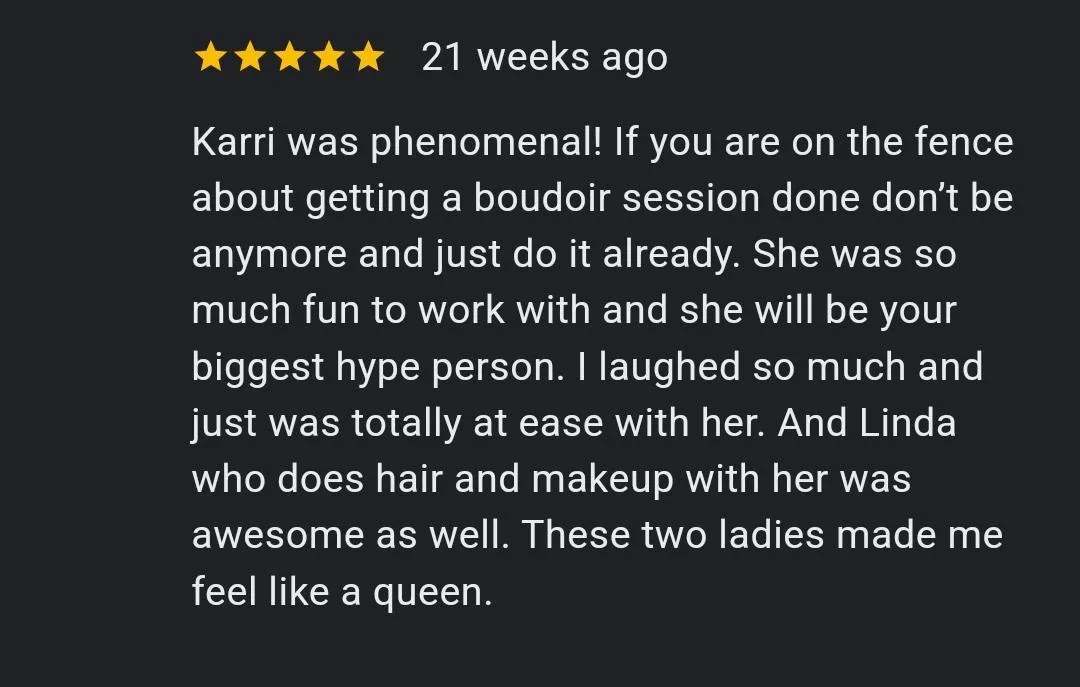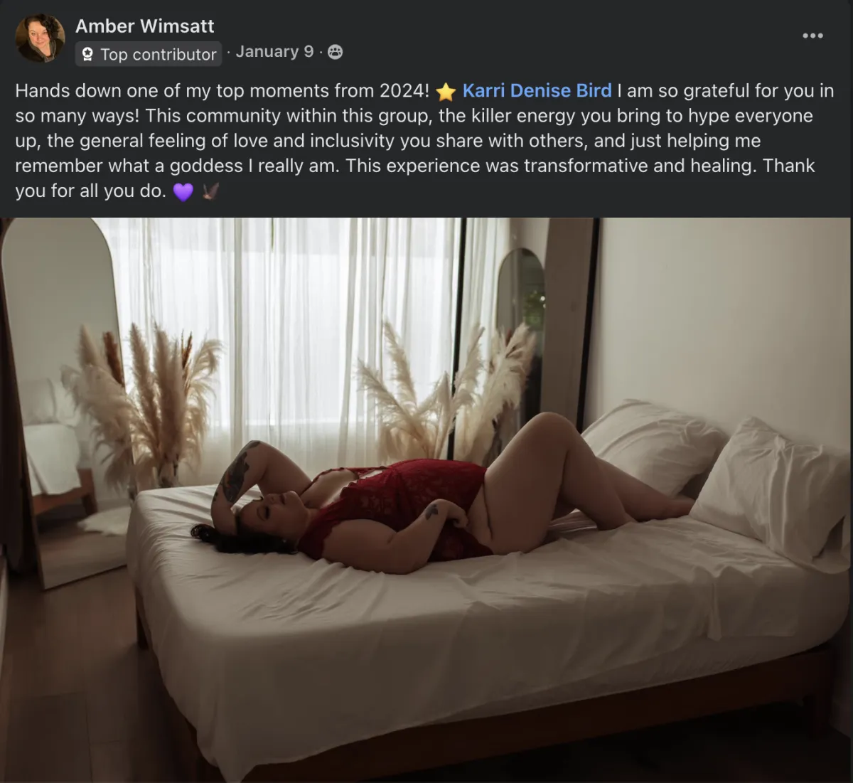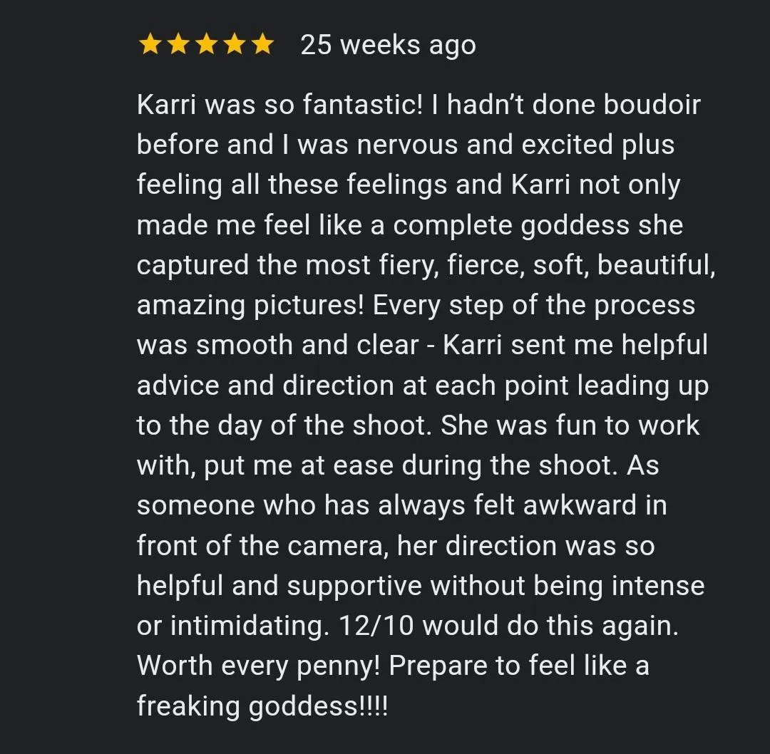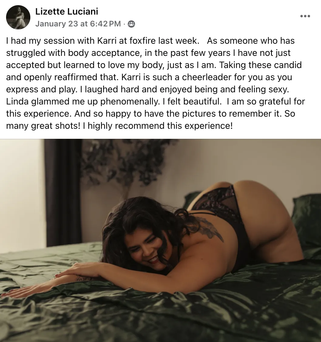 Karri has been photographing women for over a decade, and over half of those years have been spent specializing in Boudoir self-love empowerment portraiture.
